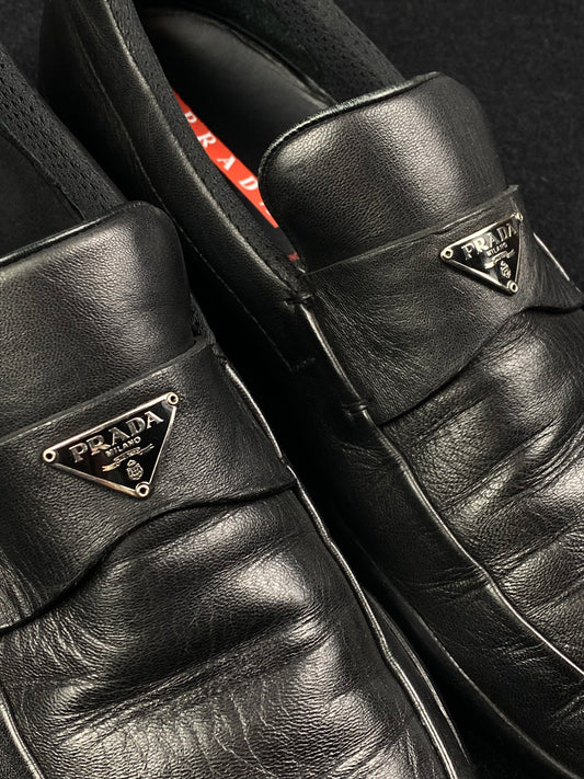 PRADA MILANO LOGO-PLAQUE LEATHER LOAFER. (44)