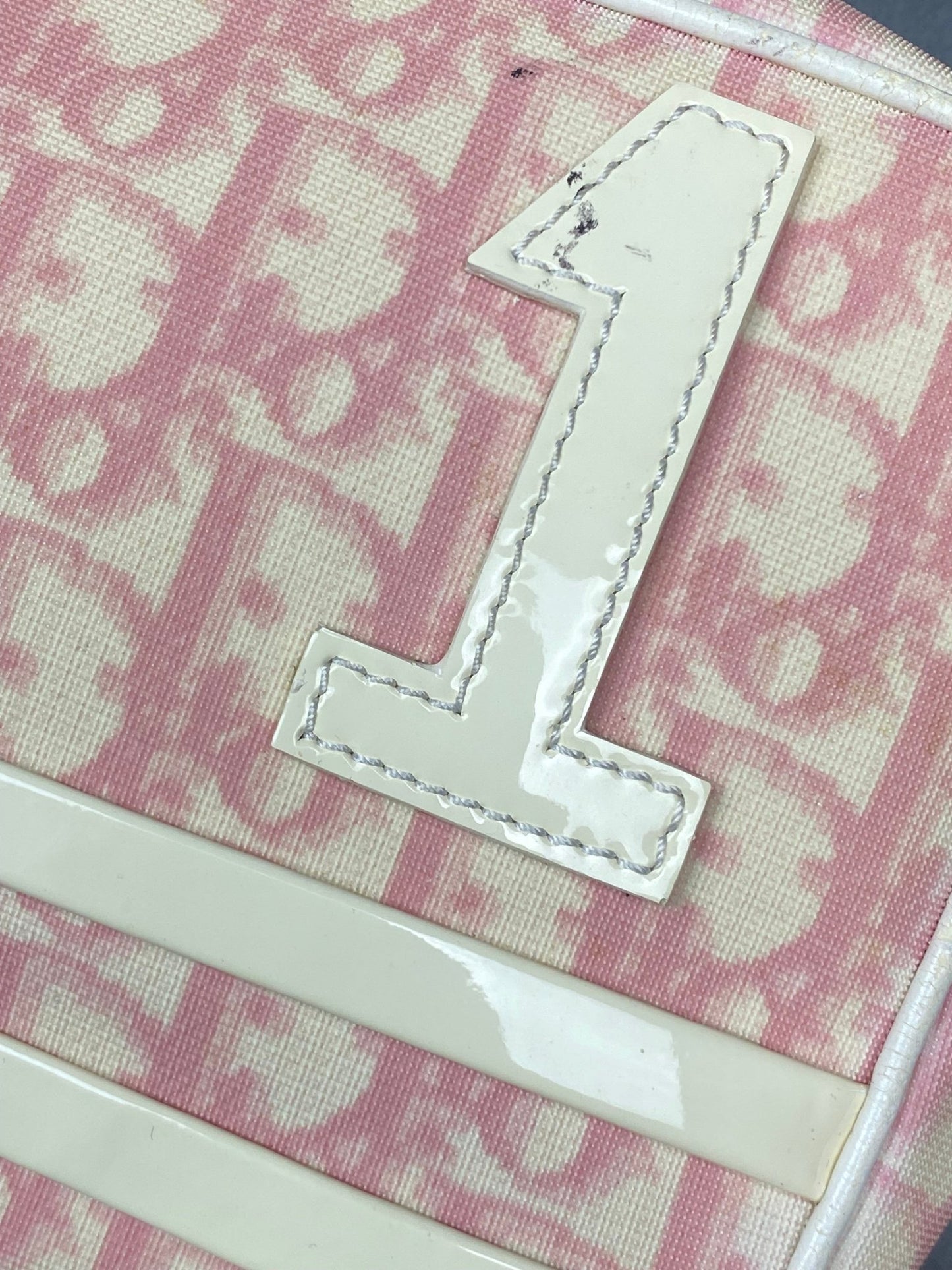 features their iconic oblique monogram pattern allover the canvas upper with a large '1' motif leather application, silver hardware with 'cd' branding and a 'cd' charm on one side of the strap, adjustable nylon strap and more beautiful leather detailing..
