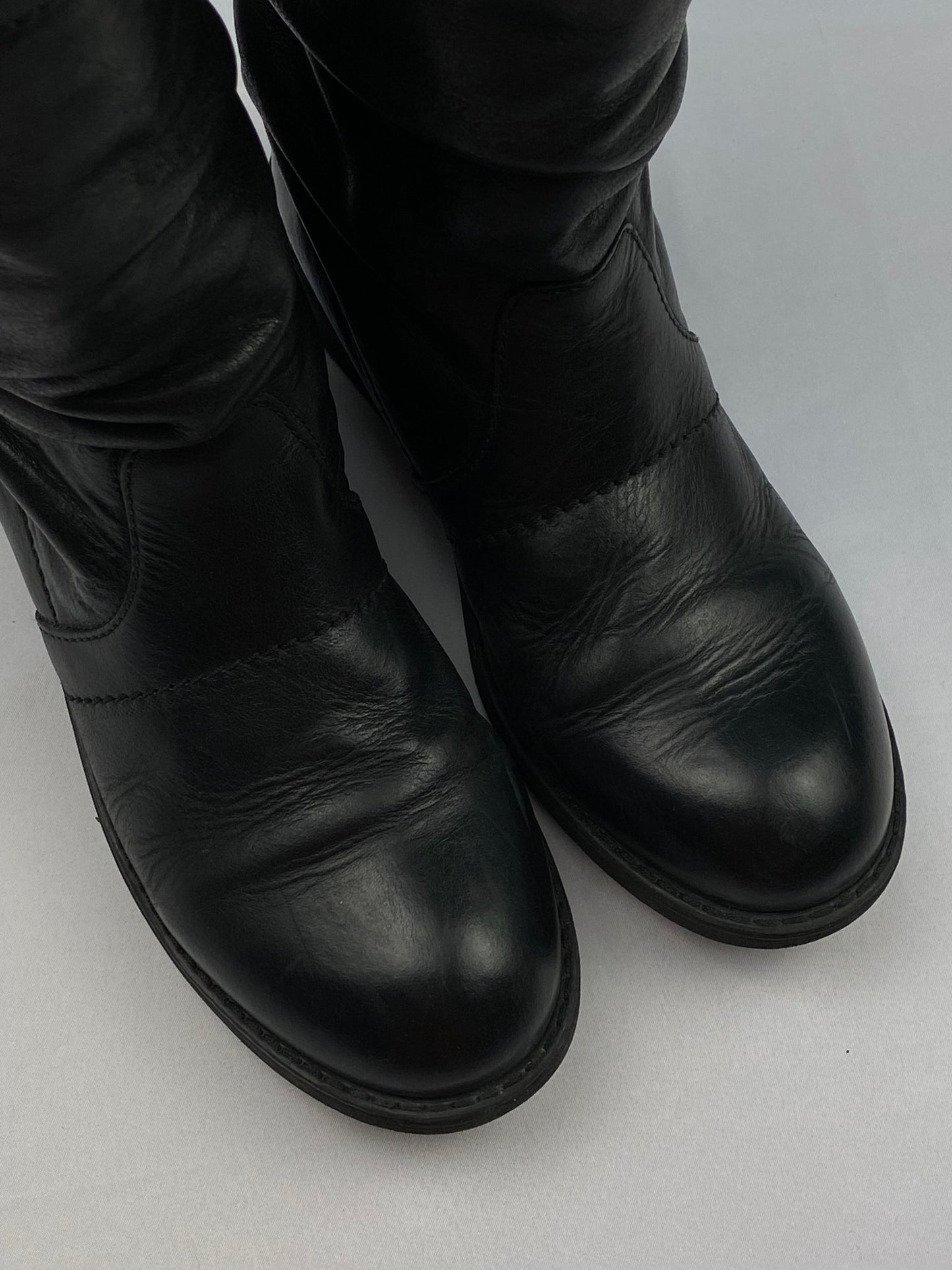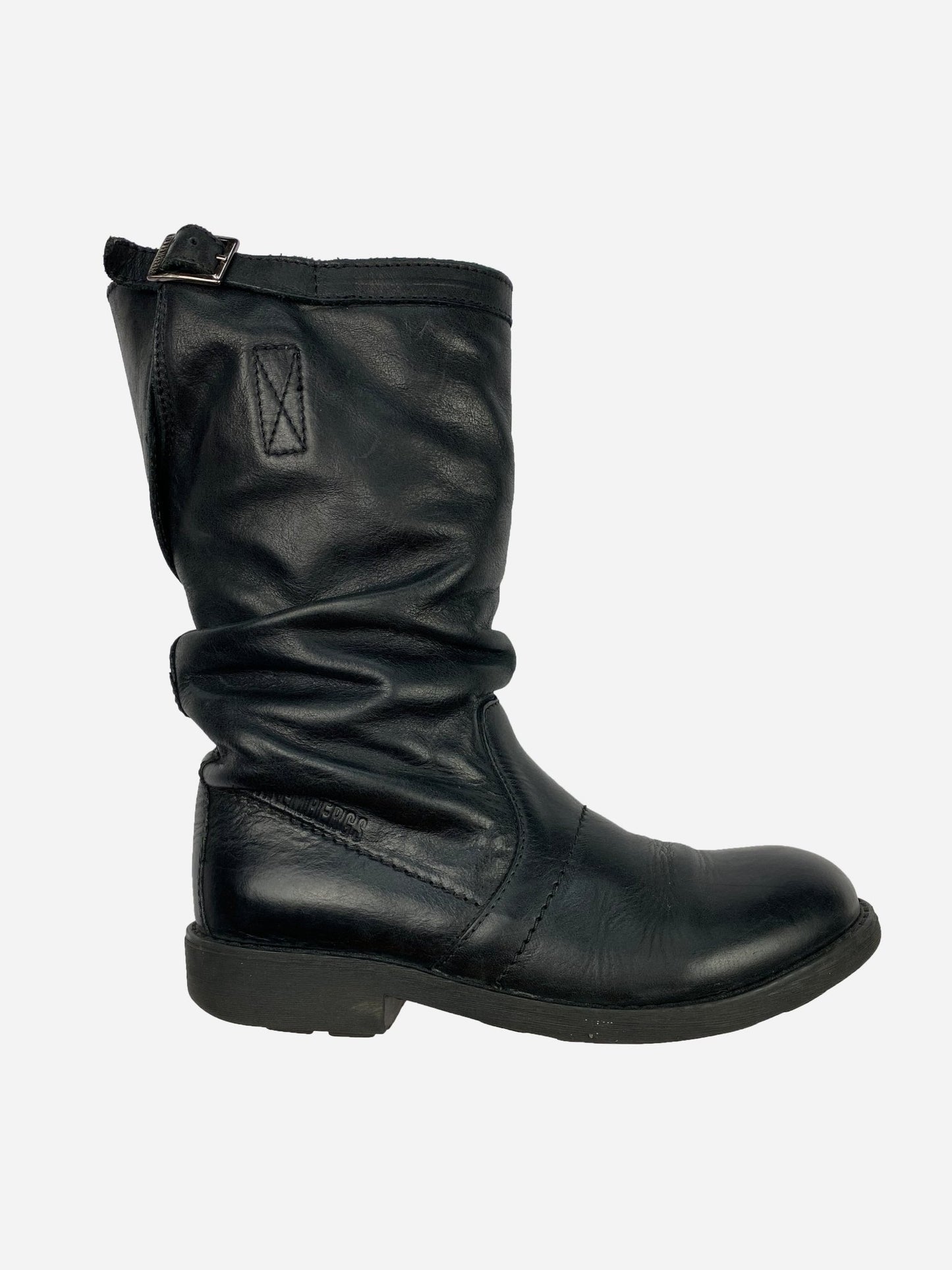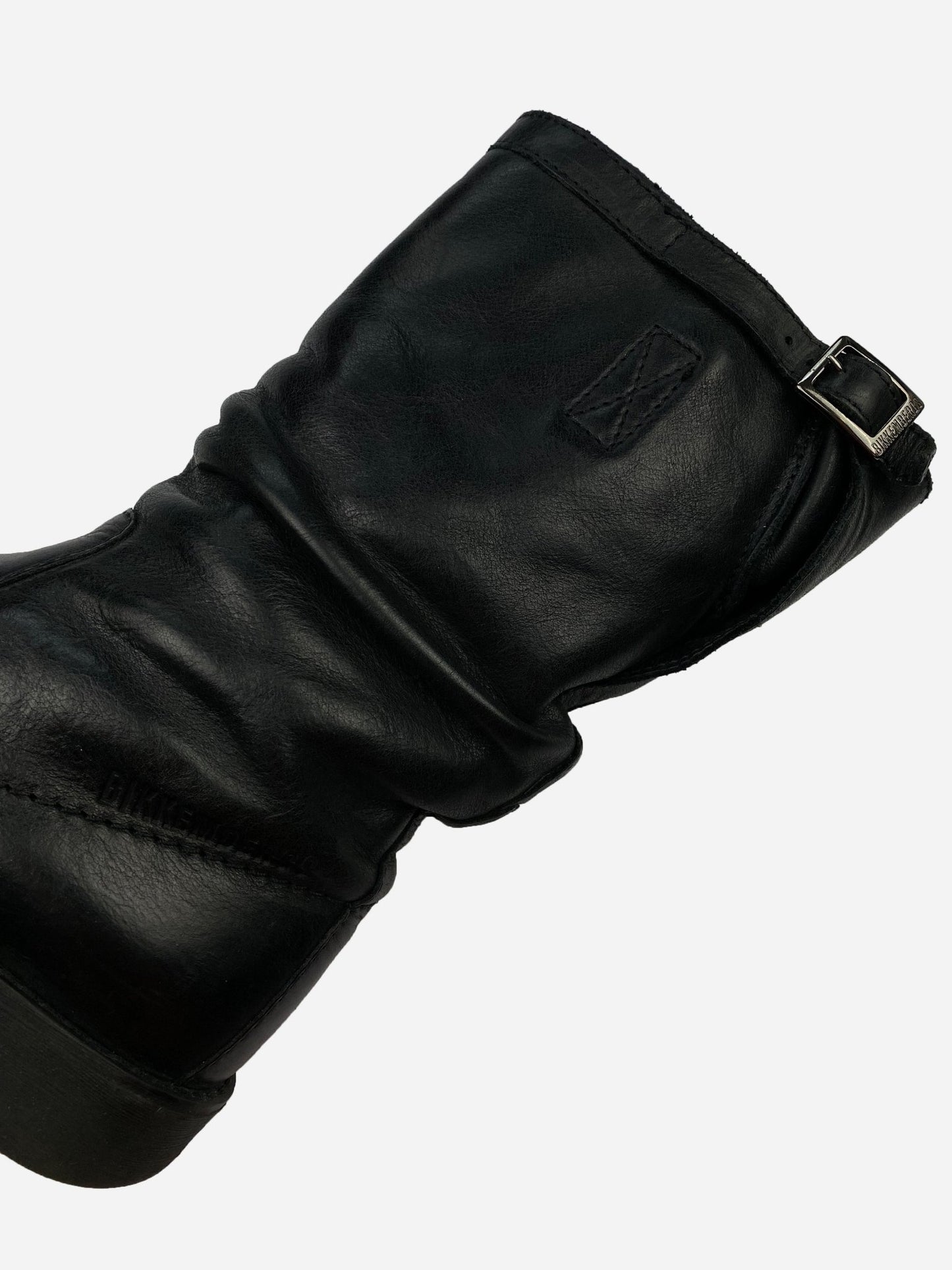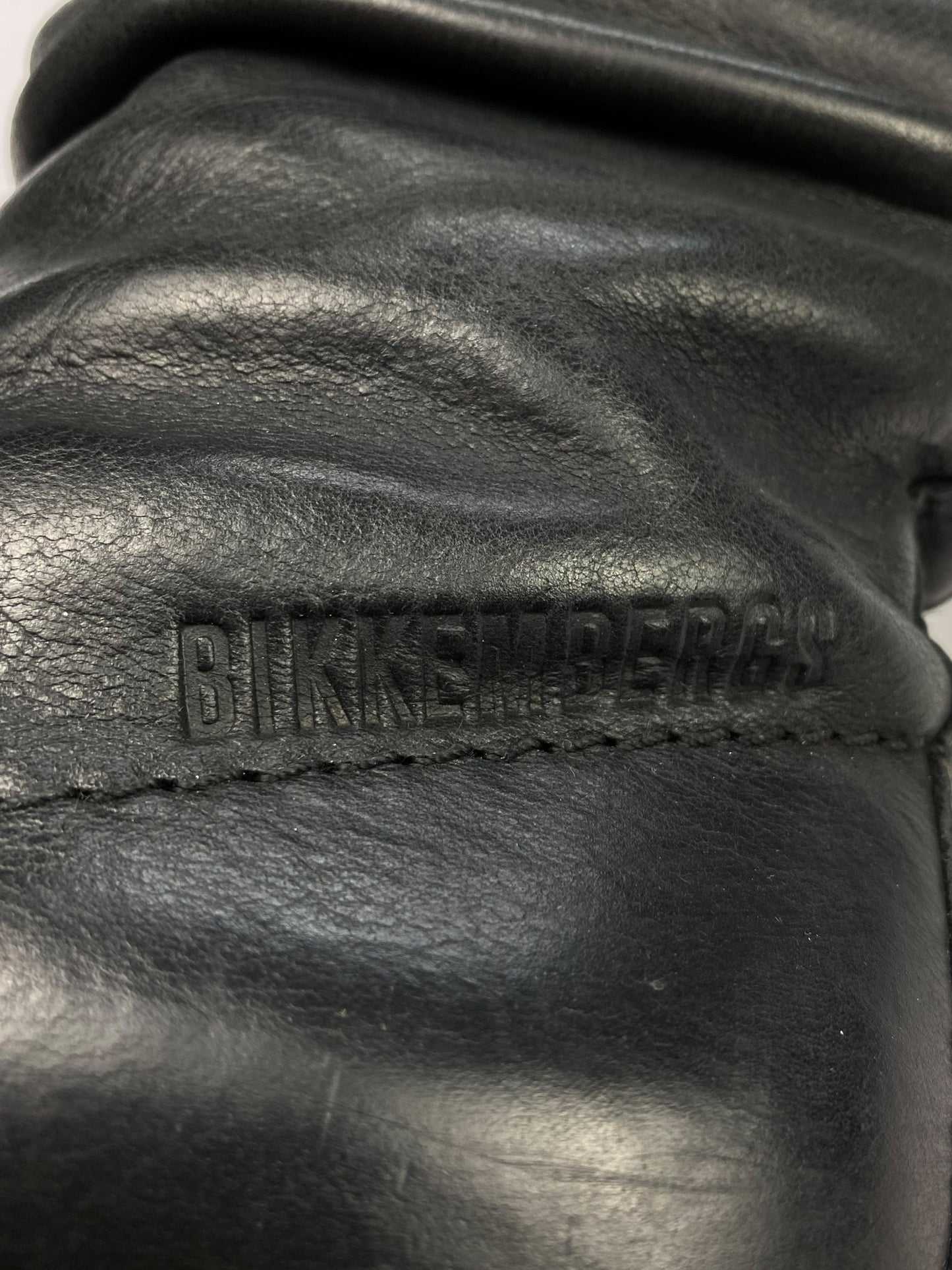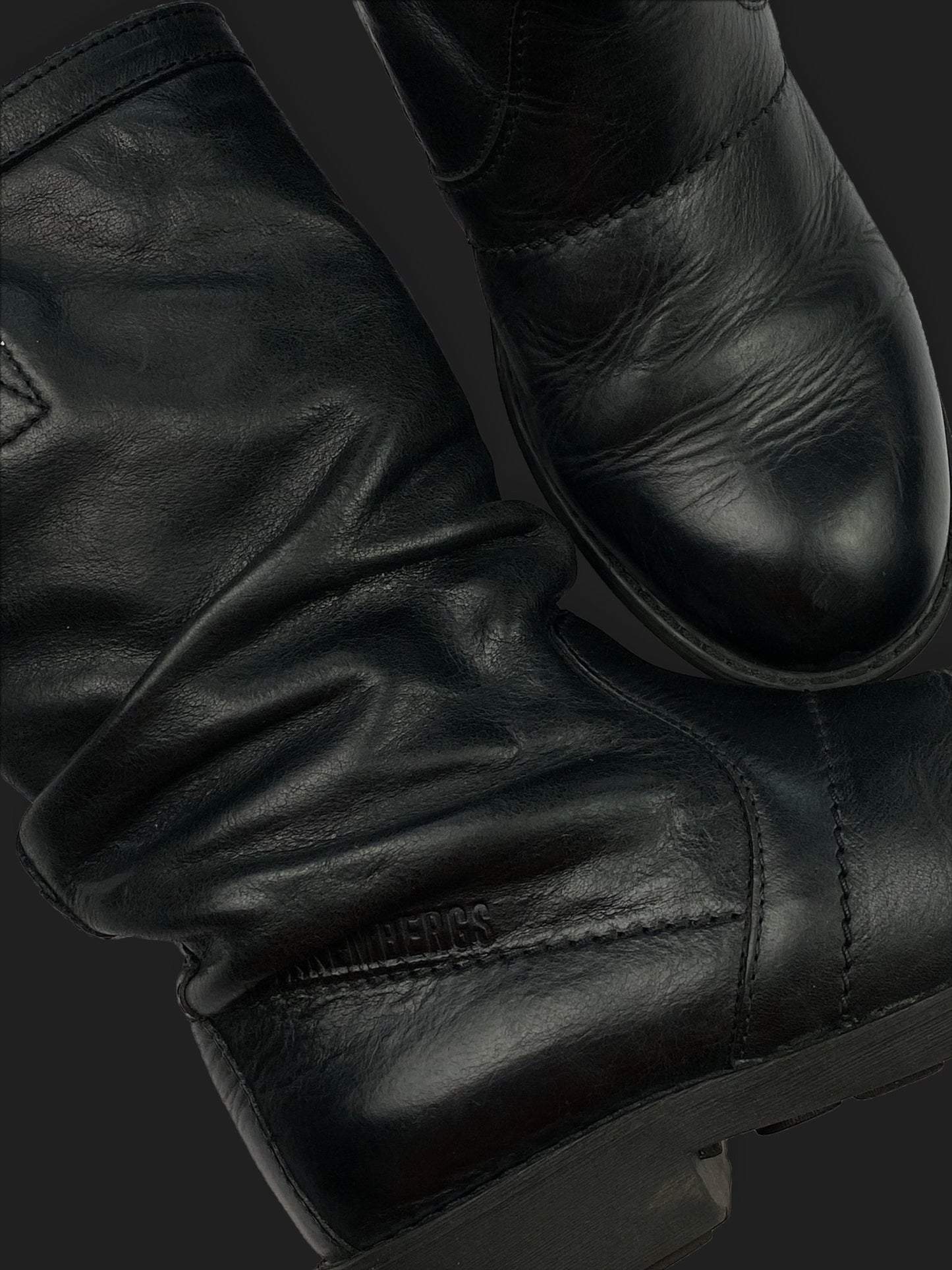 amazing wardrobe staple courtesy of dirk bikkembergs, a black leather boot with a sturdy rubber outsole. featuring a 'slouchy' design, this pair of boots is the perfect mix between bikkemberg's avant-garde approach and a timeless silhouette.