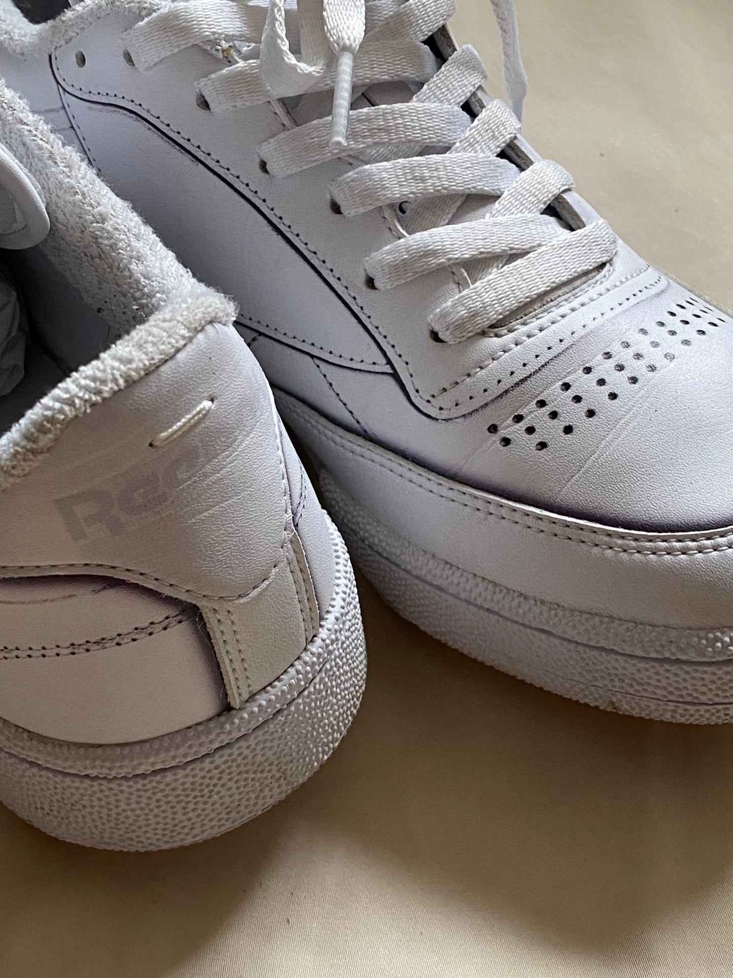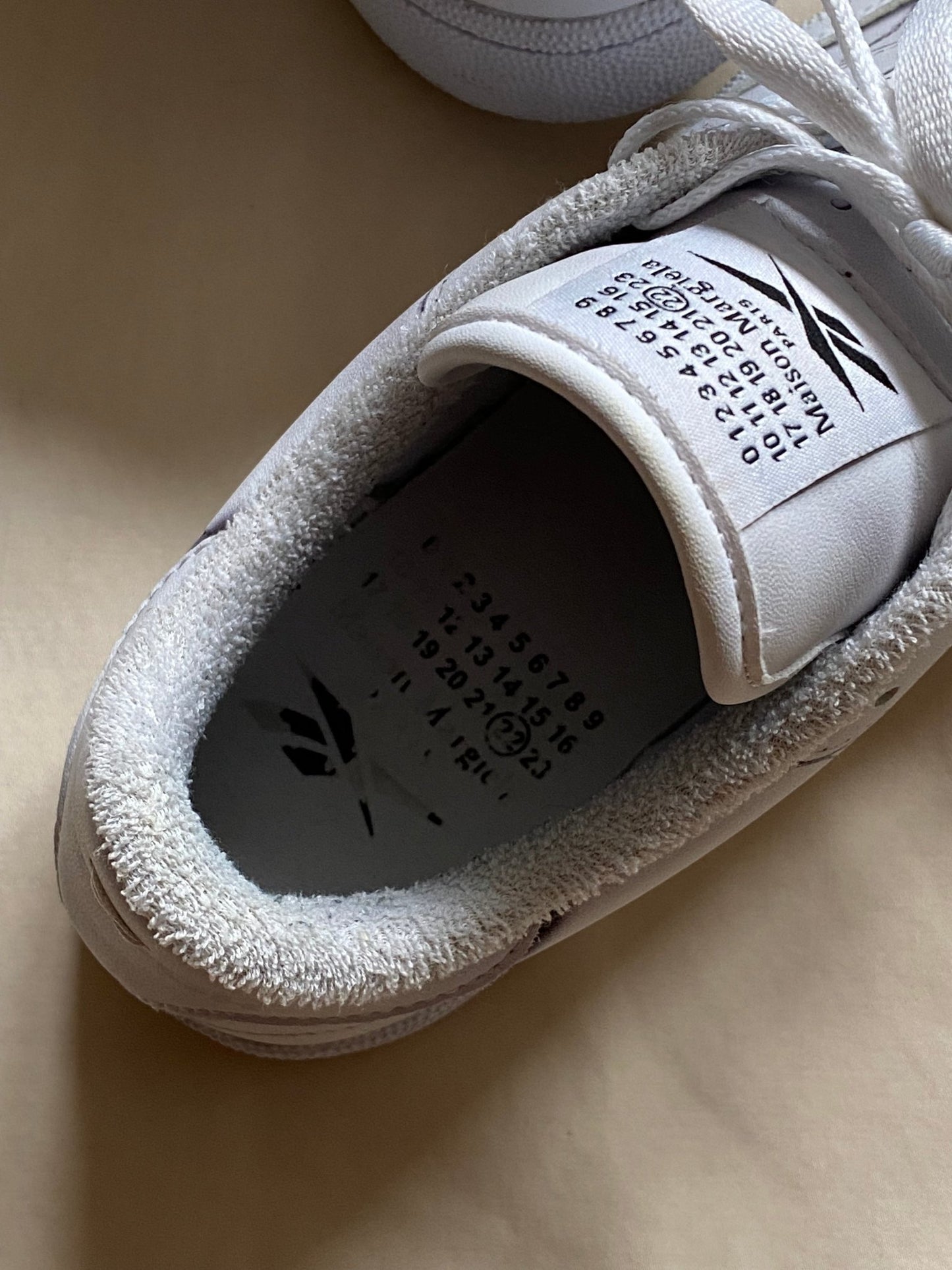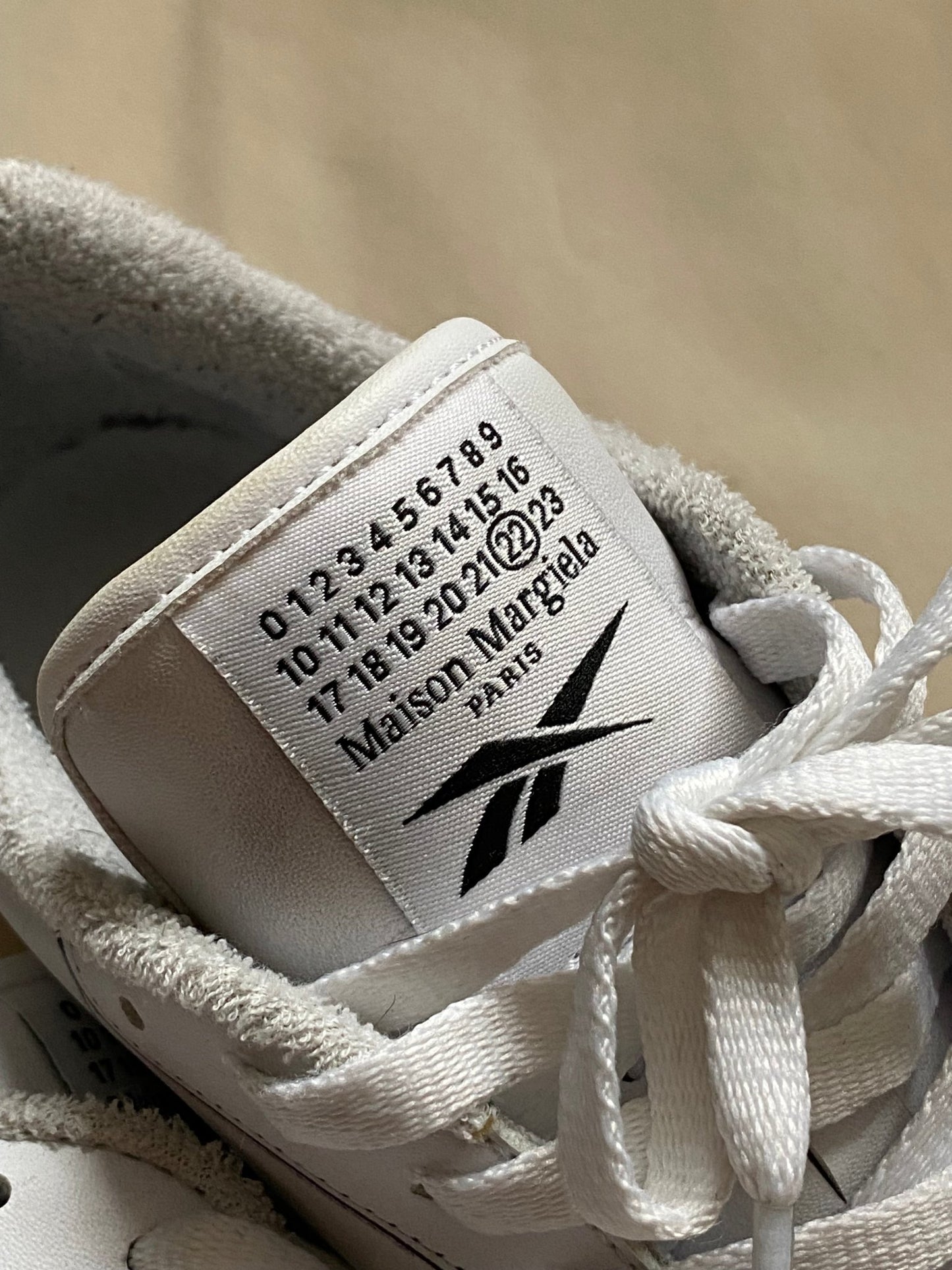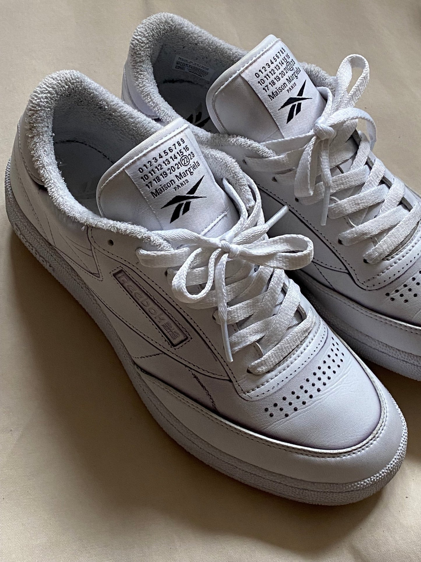 beautiful and classic white leather low-top sneakers by reebok in collaboration with french luxury label maison margiela.